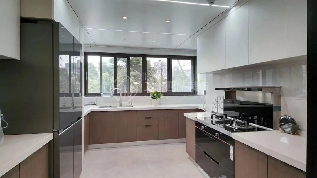 U型橱柜设计及嵌入式冰箱相得益彰,使空间更加宽敞且实用性倍增。 这种配置专为注重生活品质的业主设计,可满足日常烹饪的各种需求。