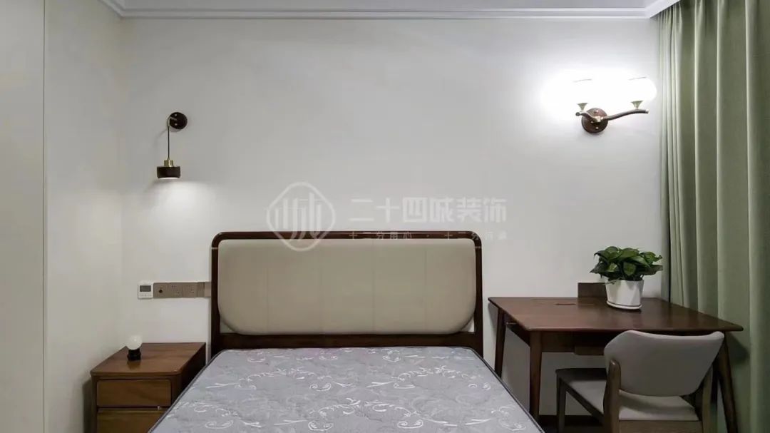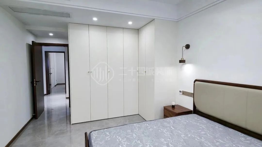 搭配木质床品,使空间显得温馨舒适,同时也透露出低调而精致的设计感。侧面一门到顶衣柜,满足日常收纳需求,大气实用。