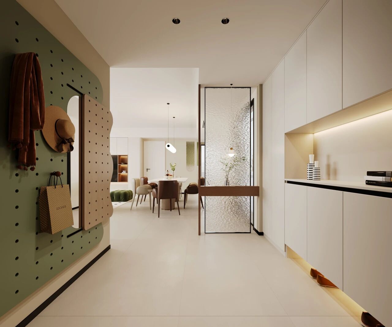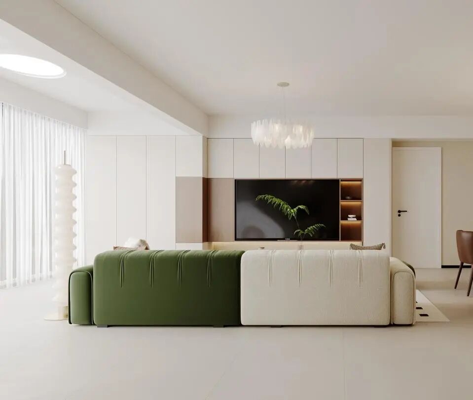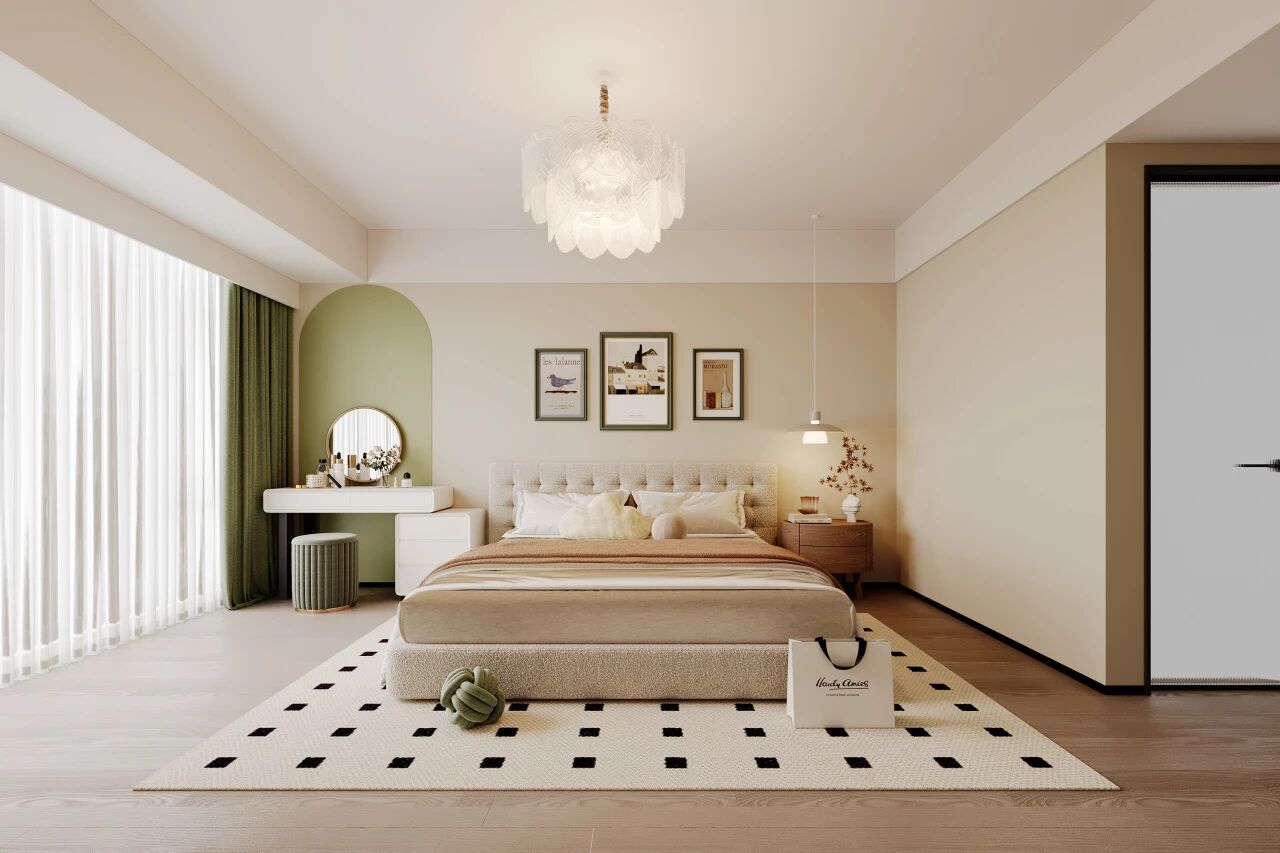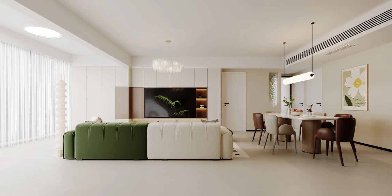 全屋以奶油米白为主基调,墙面采用微水泥质感艺术漆,地面通铺浅灰白柔光砖,构筑出温润的空间底色。