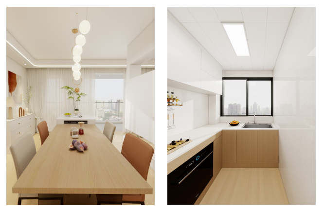 开放式布局:厨房与餐厅无缝连接,增强空间的通透感,适合小户型家庭。