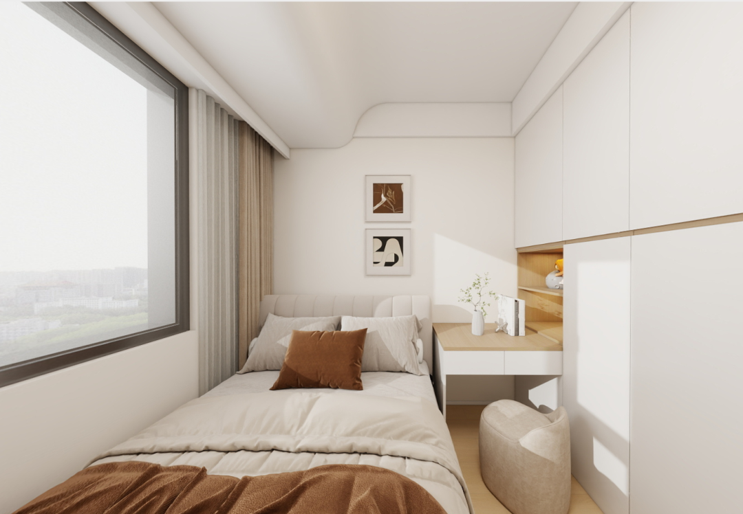 储物设计:嵌入式衣柜和床头柜最大化利用空间,保持视觉上的整洁。