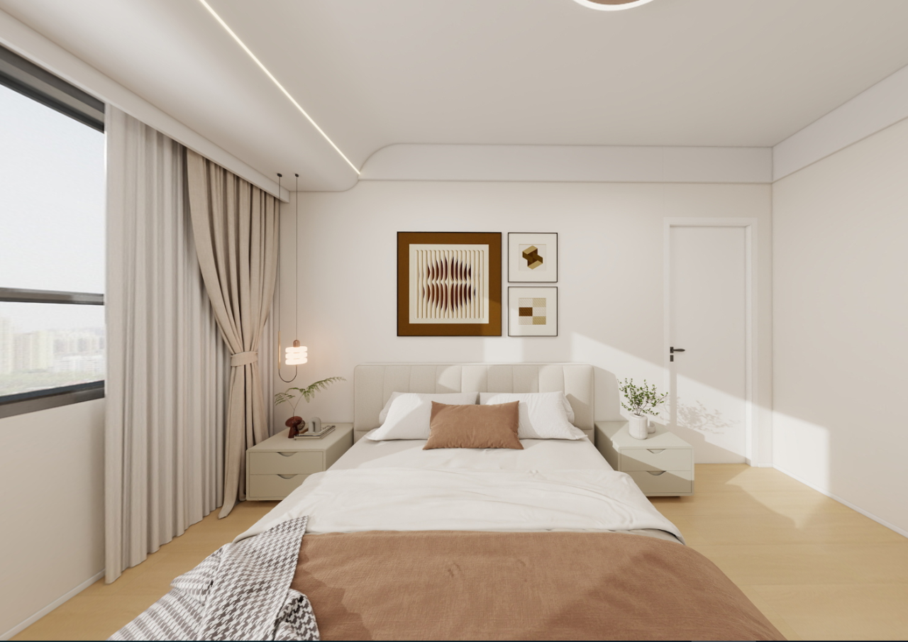 色彩搭配:中性色调贯穿始终,搭配少量亮色软装,营造出宁静的睡眠环境。