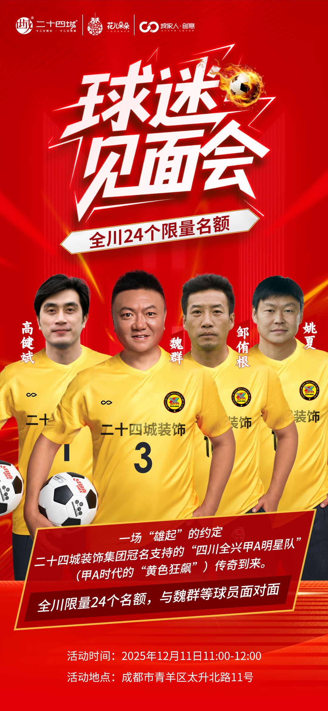 12月11日,当“老甲A”的战火在双流赛场燃烧,一段更为珍贵的场下重逢将在二十四城装饰温馨上演。由传奇队长、“魏大侠”魏群亲自带队,四川全兴甲A明星队的多位功勋球员将暂时脱下战袍,走进二十四城装饰。这不是一次简单的商业露面,而是一场由冠名商倾力搭建的、家庭般的老友聚会。