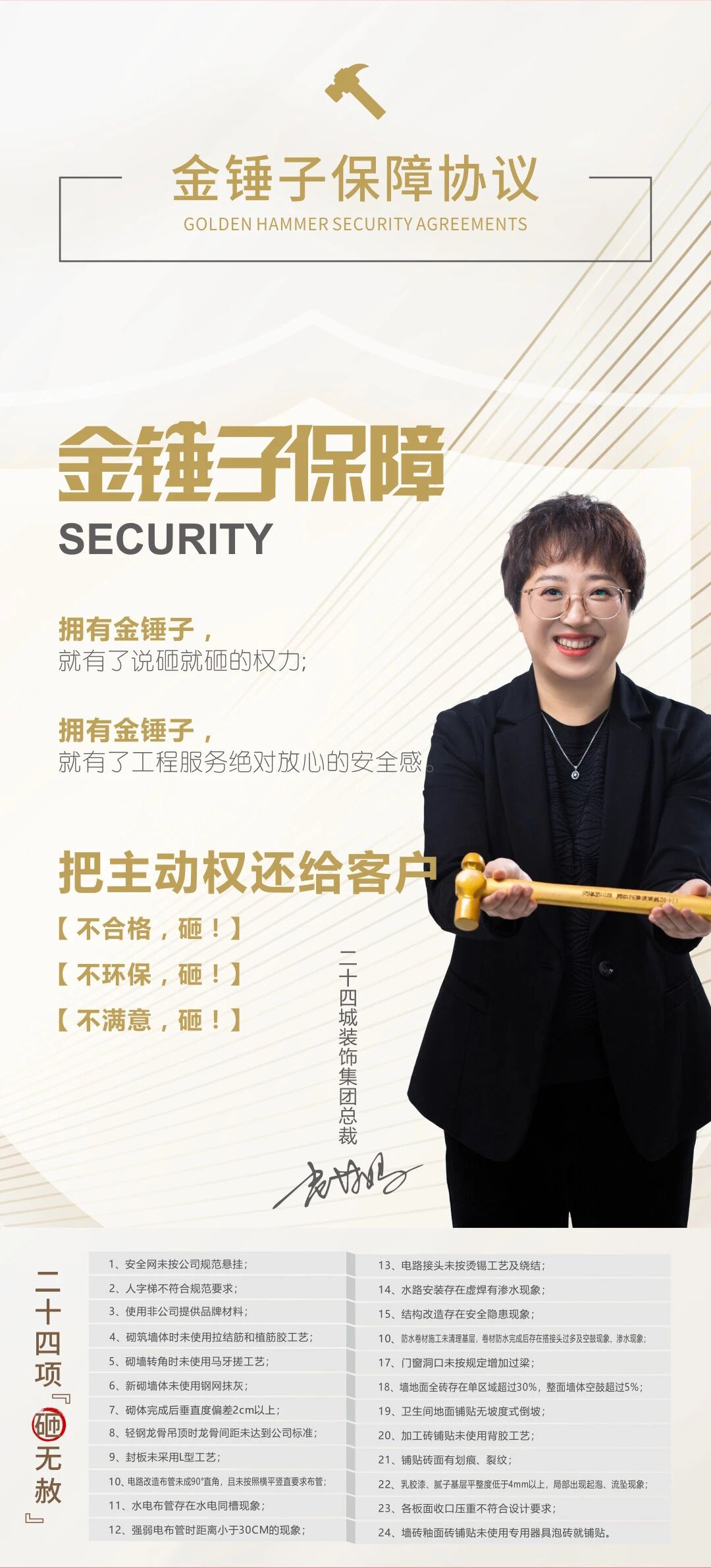 “我们承诺:设计团队平均从业10年以上,提供从设计到入住的全案服务,让专业洞察落地为美好生活;实行金锤子工程保障,把主动权还给客户,不合格—砸!不环保—砸!不满意—砸,以严苛标准兑现品质承诺;依托集团200+品牌直供体系,打破中间环节,实现环保透明的高性价比交付。”